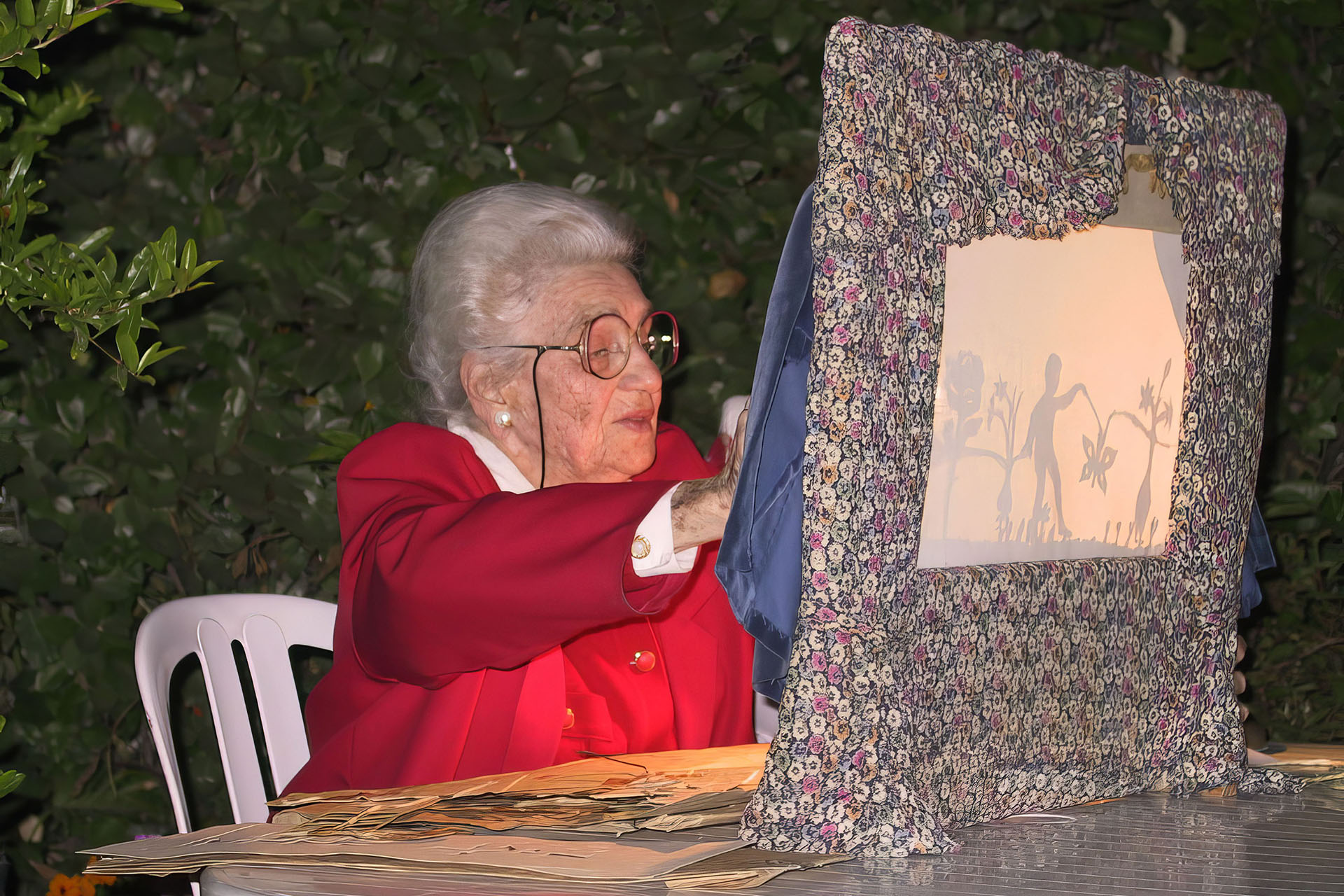 אמא נראית כתמיד כאמנית צעירה שבאה הדורה בלבושה, עם כל האופטימיות והרצינות שאיפיינה אותה בעת הצגת הצלליות. עמדתי מהצד והצטרפתי לשירת נעימות "הילד החרוץ" ביחד עם אבא. אמא ואנחנו הפעלנו, מבלי להידבר, כוח פנימי רב להתגבר על אפסות התגובה. ברור היה למציגי הצלליות ולאחריהן, שקופיות הפריחה של האביב שצריך להישאר אופטימי ולחייך על "הבמה". אם היתה מחיאת כפיים אחת או שתיים, היה זה מצד חנה מארגנת הבילוי של האנשים והנשים שבאחריותה.