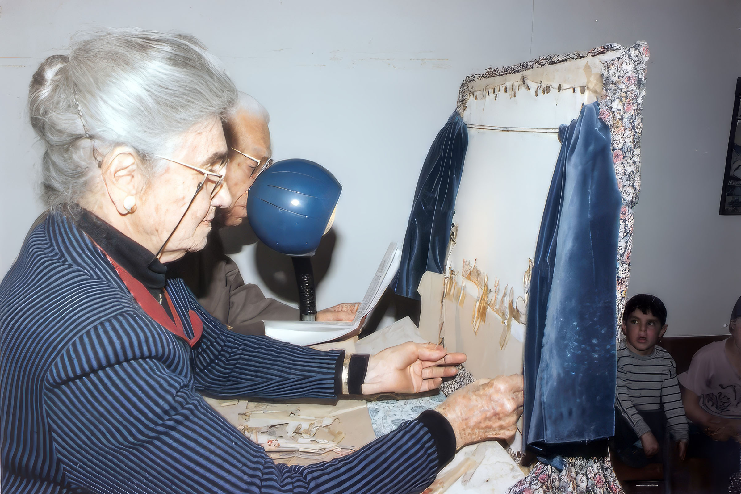 זכור לי שנתנו לי לגזור במספריים הקטנות. במספריים הגדולות אמא או אבא גזרו את הגזירה העיקרית, ונתנו לי "השלמות" במספריים הקטנות. זכור לי שאת רוב הגזירות וההדבקות עשינו על מכונת התפירה שהיתה רהיט שלם עם משטח עבודה שלם, שנפתח ויוצב על הדלת הקדמית של הארונית שהכילה את מכונת התפירה שהופעלה ברגל. את מסגרת העץ שעליה נמתח וחוזק המסך, קבלנו מהנגריה של שקד.
